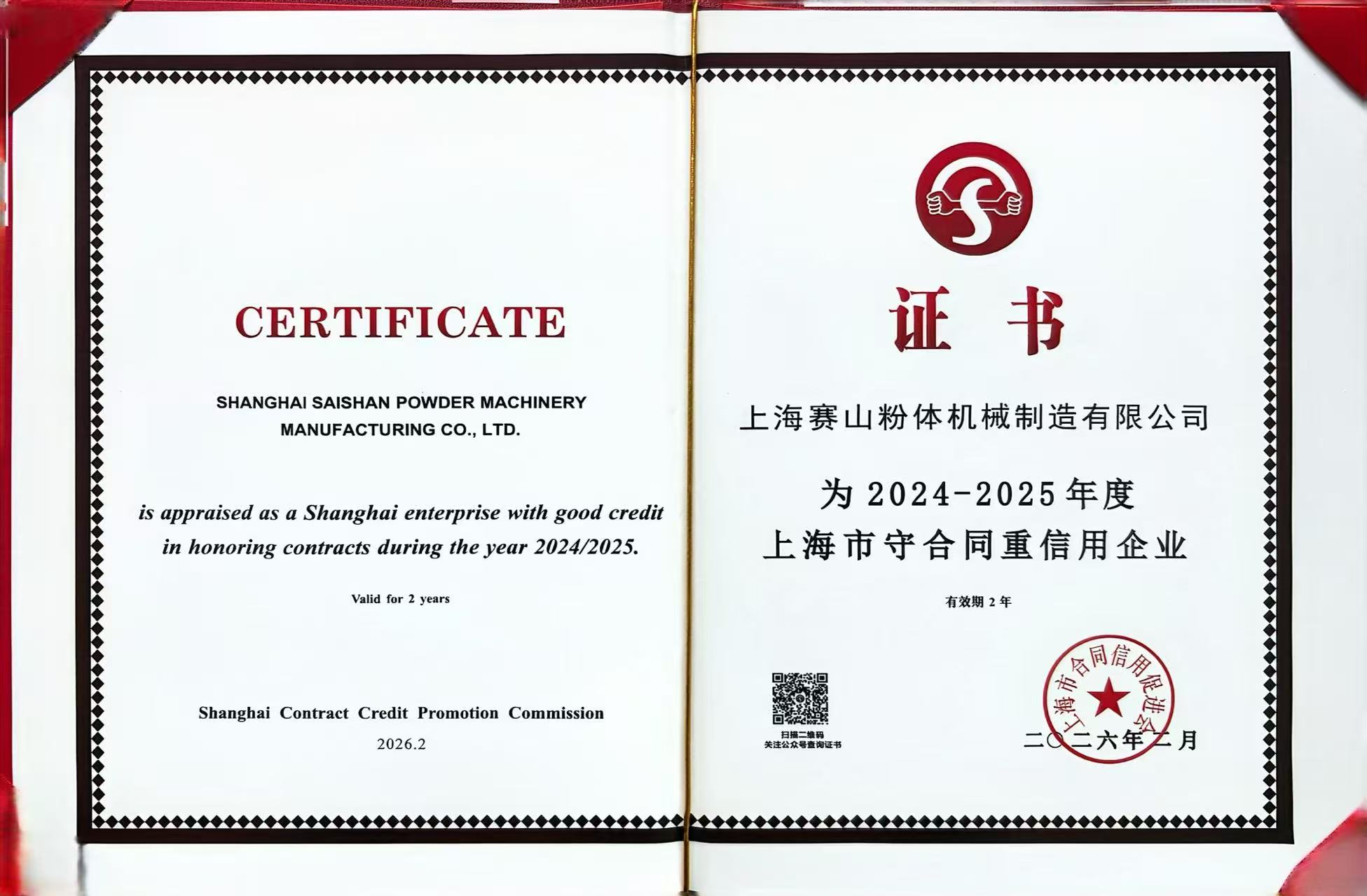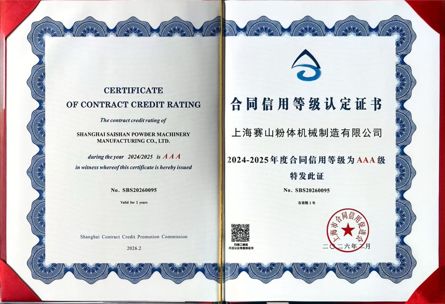 赛山粉体获得上海市守合同重信用企业称号,凭借规范的合同管理制度,良好的商业诚信。再次顺利通过上海市企业合同信用等级评估与"上海市守合同重信用企业"评审认定,荣获2024-2025年度"上海市守合同重信用企业"称号,并获评2024-2025年度"合同信用等级"AAA级。