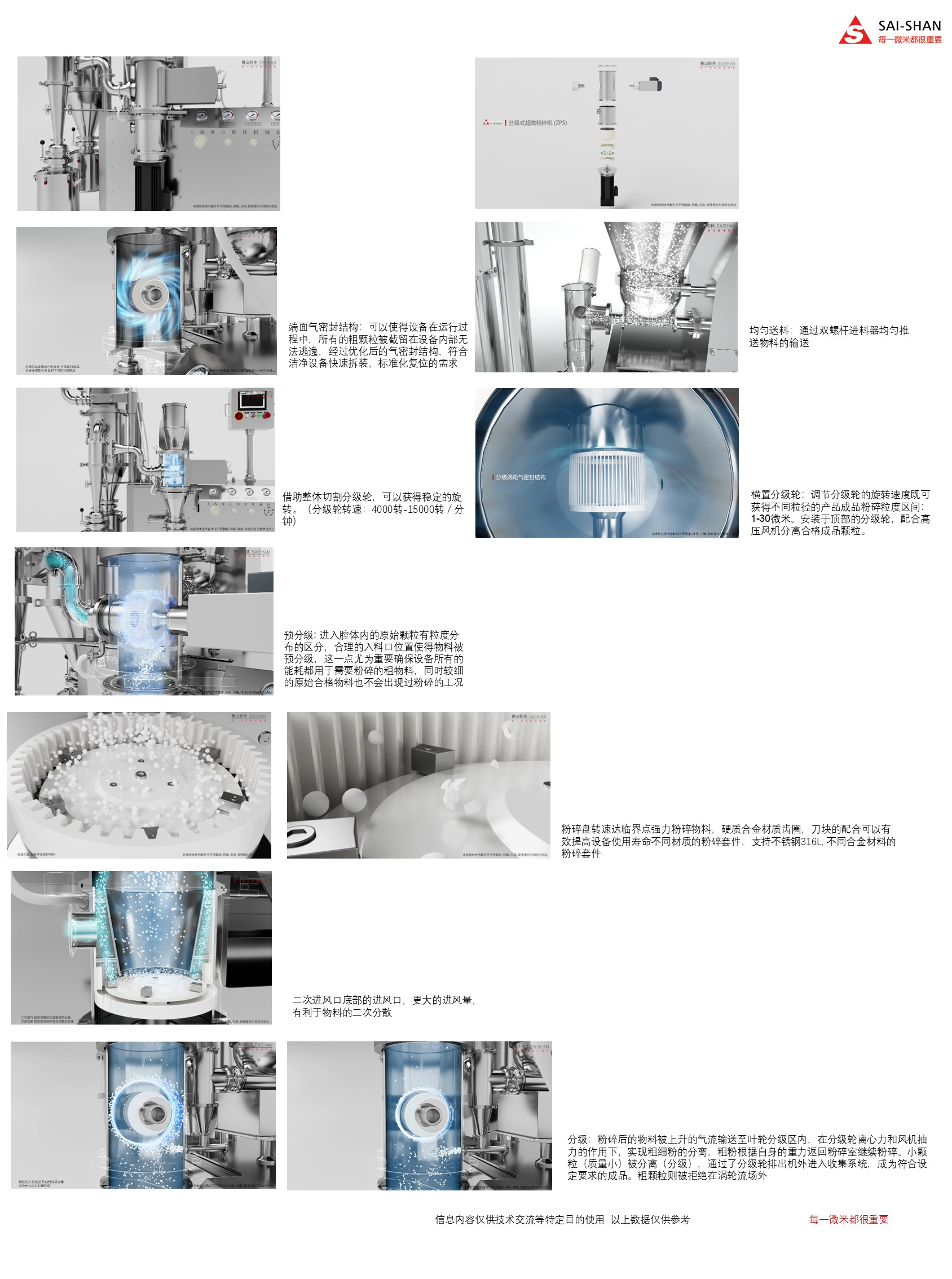 全新的设备设计方案,在一台设备上实现了气流粉碎,机械粉碎,高效涡轮分级机三种功能,集成了干法粉碎与分级的三种主流技术。该装备使得气流粉碎,机械粉碎,高效分级全性能的组合在了一起,让注重效率性能为先的研发小试阶段有了一个更为精良,高效的选择,同时让成本控制变得简单。 FWJ型机械超微粉碎机通常可以将成品物料粉碎至30-80微米(约:100-1250目)。设备通过设计在机体底部粉碎室的旋转刀盘与齿圈高速冲击物料,产生粉碎的效果。同时设计在设备顶部的卧式分级轮高速旋转所产生的离心力,与高压风机所产生向心力,相互作用分选成品物料的颗粒粒度位于底部的进风口进入大量空气,对机体部件进行降温,在引风机的作用下高温随空气被抽离设备,使物料有效避免与高温接触。成品物料在离开气流粉碎主机后,通过旋风分离器,除尘器完成物料回收,空气经过HEPA过滤器排空。